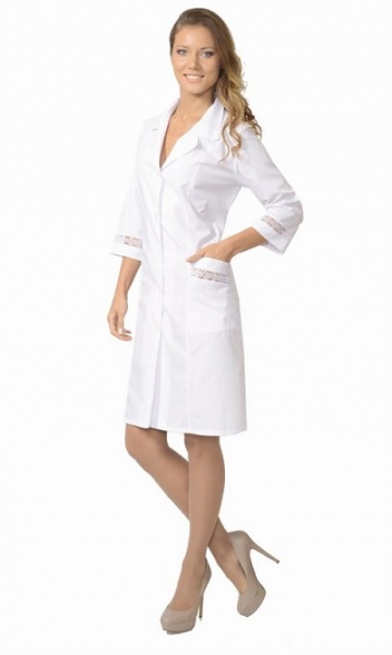 Халат полуприлегающего силуэта, с центральной застёжкой на 5 петель и пуговицы, с отложным воротником, с нижними накладными карманами с фигурными планками. Рукава 3/4. Воротник, карманы, рукава с ажурной отделкой. По талии халат регулируется поясом ГОСТ 12.4.131-83