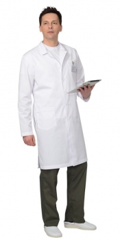 Халат мужской предназначен для медицинского персонала. Халат прямого силуэта, с центральной бортовой застежкой на пять петель и пуговиц, с отложным воротником и лацканом, с втачными длинными рукавами, с верхним нагрудным карманом на левой полочке и двумя нижними накладными карманами, спинка по линии талии с хлястиком на пряжке и пуговицах. Халат с боковыми разрезами. Особенностью модели являются разрезы в боковых швах для свободного проникновения рук в брючные карманы. ГОСТ 12.4.132-83