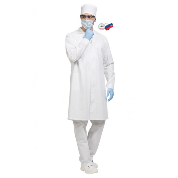Комплект состоит из: куртки, брюк, фартука, колпака и шейного платка.