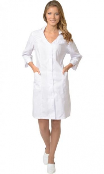 Укороченный халат полуприлегающего силуэта. Особенность модели-декоративные защипы по кокеткам и на карманах. Воротник-стойка. Рукава 3/4. ГОСТ 25294-2003