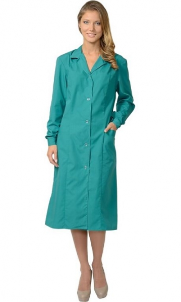 Классическая модель с нагрудным и двумя нижними накладными карманами, отложным воротником и длинными рукавами с манжетами. Ширина халата по линии талии регулируется хлястиком. ГОСТ 12.4.131-83