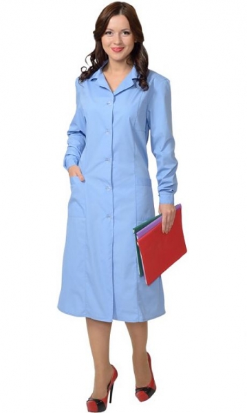 Классическая модель с нагрудным и двумя нижними накладными карманами, отложным воротником и длинными рукавами с манжетами. Ширина халата по линии талии регулируется хлястиком. ГОСТ 12.4.131-83
