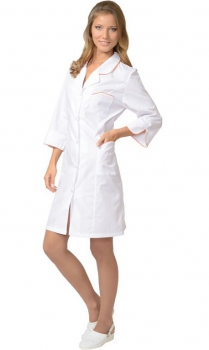 Халат с центральной застежкой на пуговицы. На полочках вертикальные рельефы. Фигурные карманы, воротник и манжеты с отделкой в виде канта контрастного цвета. Рукава 3/4. ГОСТ 25294-2003