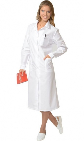 Классическая модель с отложным воротником и длинными рукавами с манжетами. Ширина халата по линии талии регулируется хлястиком. ГОСТ 12.4.131-83, ТО