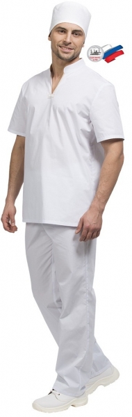 Комплект состоит из: куртки, брюк, фартука, колпака и шейного платка.