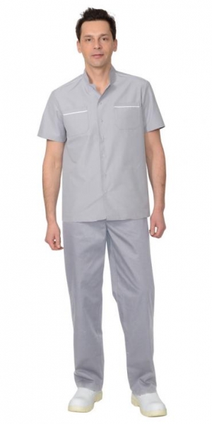 Блуза прямого силуэта, с центральной бортовой застежкой на кнопки, с воротником стойка, с верхними и нижними накладными карманами, с короткими, втачными рукавами. Кокетки и нагрудные карманы отделаны кантом контрастного цвета. Брюки прямые на притачном поясе, частично стянутым на эластичную тесьму, брюки с внутренними боковыми карманами. ГОСТ 9897-88