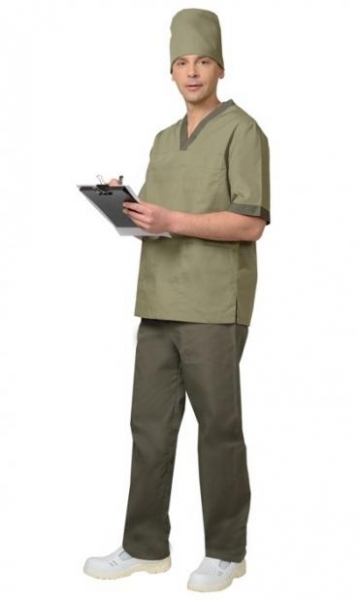Блуза прямого покроя с V-образным вырезом горловины. На полочке один верхний и два нижних накладных кармана. Рукава короткие. Вырез горловины и манжеты рукавов из контрастной ткани. Брюки прямого покроя на резинке. Колпак одноцветный с отворотом. ГОСТ 9897-88