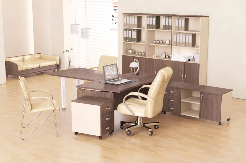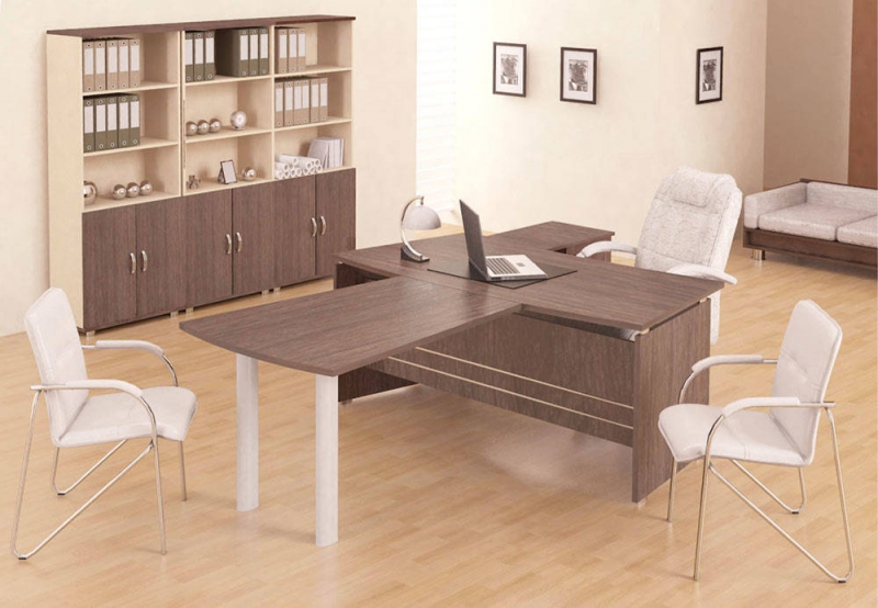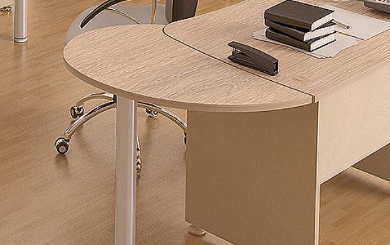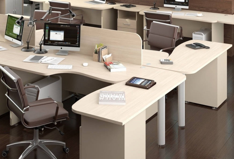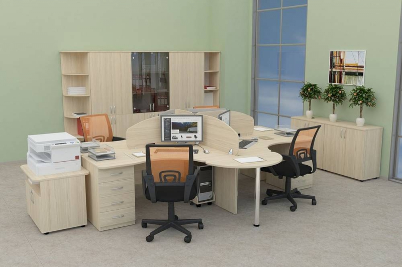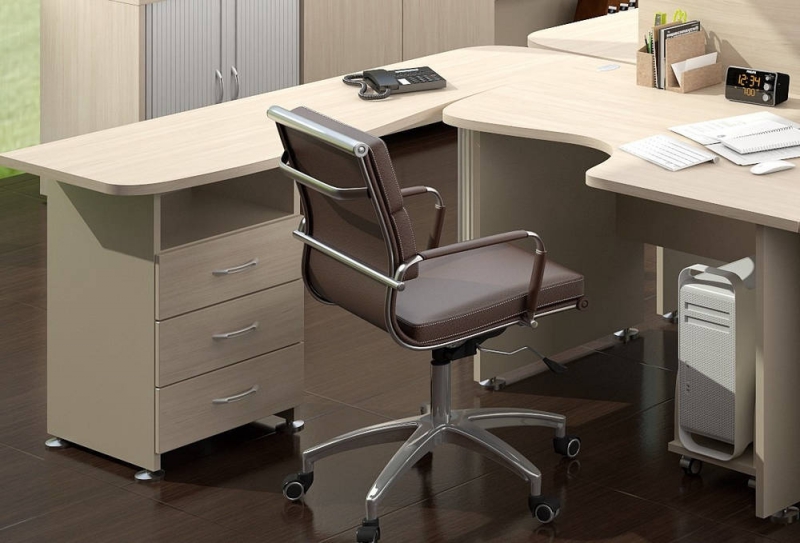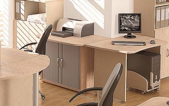 Изогнутые линии столешниц, являющиеся визитной карточкой мебели для персонала «Модерн» - не только модная тенденция, но изобретение конструкторов, позволяющее снять напряжение в спине и шее сотрудника во время работы за компьютерным или рабочим столом.Мебель «Модерн», исполненная в классическом стиле, представлена в трех цветах: бежевый, светлый или темный дуб Шамони. Благородные тона фасадов и компактные размеры позволяют создавать уютные, но полноценные рабочие места даже на скромной площади.