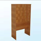 Изготовлен из ЛДСП, торцы облицованы кромкой ПВХ 0,4 мм. Шкаф имеет 24 ящика на роликовых направляющих, каждый ящик снабжен металлическим штырем, на котором размещаются карточки, на передних панелях ящиков установлены ручки-кнопки