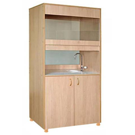 Состоит из двух секций. Верхняя секция с подъемной стеклянной рамой, на столешнице с пластиковым покрытием установлены кран для воды и полипропиленовая раковина размером 160х160х158. В верхней крышке шкафа имеется отверстие под вытяжку диаметром 140 мм. Нижняя часть шкафа закрыта дверями и разделена вертикальной перегородкой на две секции, одна секция предназначена для размещения сантехнических подводок, во второй секции 2 ниши. Шкаф изготовлен из ЛДСП и облицован кромкой ПВХ 0,4 мм. Ножки-опоры регулируемые по высоте, ручки-скобы металлические