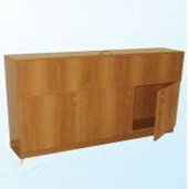 Изготовлена из ЛДСП, торцы облицованы кромкой ПВХ 0,4 мм. Верхняя часть тумбы имеет откидную дверь, облицованную кромкой ПВХ 2 мм. Нижняя часть - с тремя дверями, на дверях установлены ручки-скобы металлические. Предусмотрена возможность крепления тумбы к стене