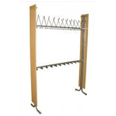 Металлокаркас состоит из двух Л-образных стоек изготовленных из двух гнутых труб диаметром 22 мм, перпендикулярно к которым вверху приварена труба 25х25мм. Стойки соединены между собой двумя стяжками из трубы 40х20мм, на верхней стяжке с двух сторон крепятся 26 металлических двухрожковых крючка, на нижней стяжке с двух сторон крепятся 26 однорожковых крючка для сменной обуви. С наружной стороны к стойкам крепятся панели из ЛДСП. Металлокаркас окрашен порошково-полимерной краской. Предусмотрена возможность крепления к полу